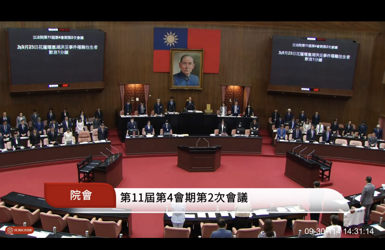 立法院周二召開院會,邀請卓揆率行政團隊進行施政報告並備質詢,在會議開始前,立法院長韓國瑜表示先為此次人員傷亡表達哀悼與深切慰問,並感謝軍警消人員、志工、熱心民眾,隨後行政團隊、立法院全體皆起立默哀一分鐘。