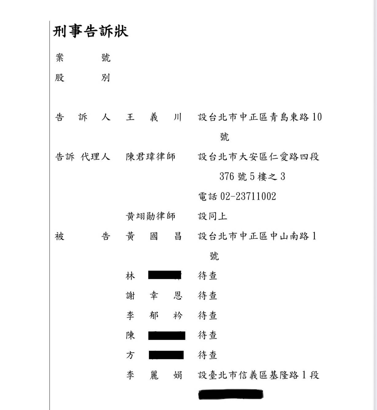 王義川上午偕律師陳君瑋赴台北地檢署提出刑事告訴,並受訪表示,他以當事人的身份提出刑事告發狀給台北地檢署,這次告發的對象包括黃國昌、李麗娟、謝幸恩,以及在他不起訴處分書裡頭的四位狗仔,總共7人。