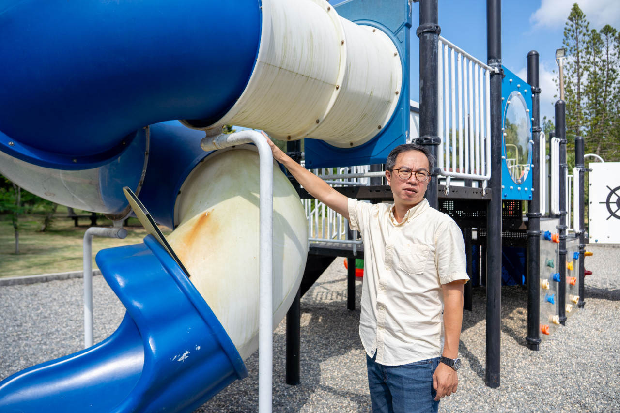 ▲在澎湖的強勁海風下,共融式遊具的維護至關重要,澎湖縣林務公園管理所所長歐東昇點出,縣府規劃維修團隊來保持遊具的可用性。