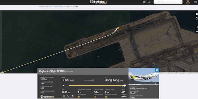 該航機由杜拜阿勒馬克圖姆國際機場(DWC)出發,於本港時間周一(20日)凌晨3時53分抵港,使用香港國際機場北跑道07L降落。根據航班追蹤網站Flightradar24.com資料顯示,涉事貨機於降落後,在使用跑道約一半時突然左轉。