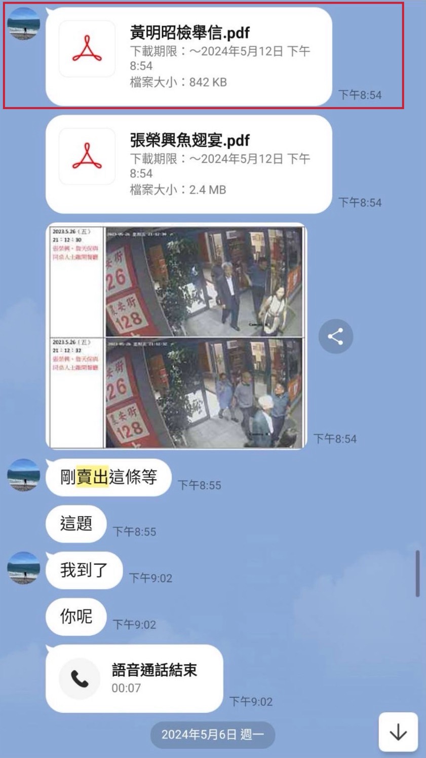 媒體人馬郁雯20日曝光多張張凱維語跟律師柯晨皓炫耀「賣出這題」的對話截圖,截圖中顯示兩份PDF檔案,一份是在「張榮興魚翅宴PDF」檔案前,一份是檔名為「黃明昭檢舉信PDF檔案」。顯見從時任的警政署長到北市警局長,行程全被狗仔集團掌握。
