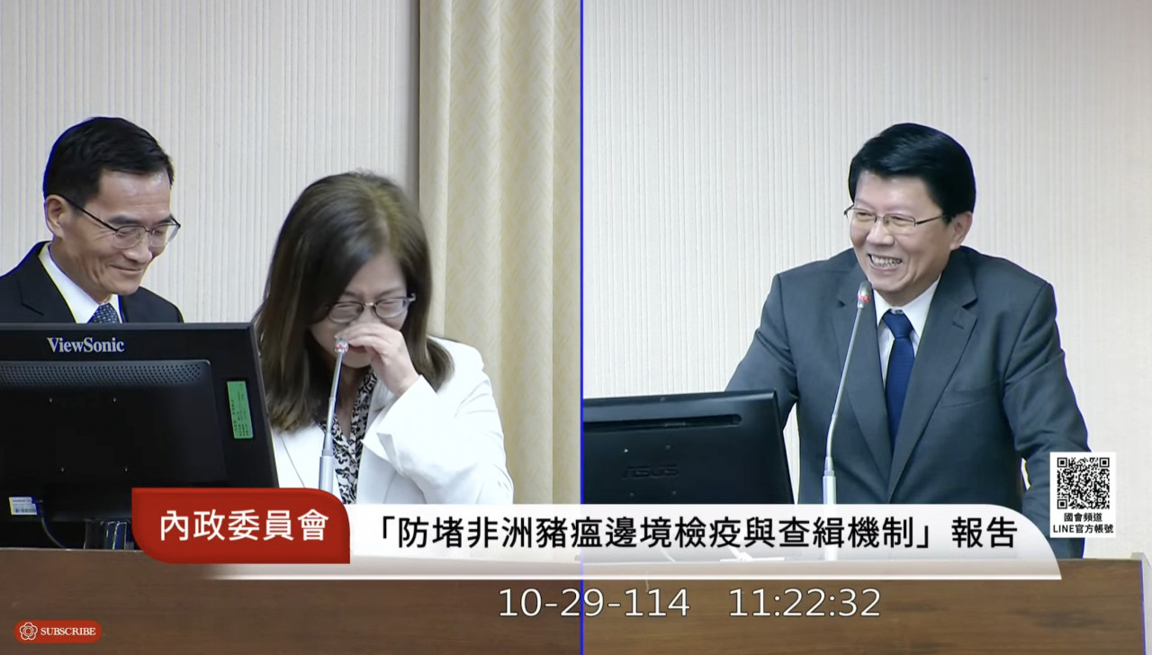 台中爆非洲豬瘟病例,立法院質詢時聚焦廚餘處理與邊境檢疫是否失守,然現場卻爆出爆笑插曲。