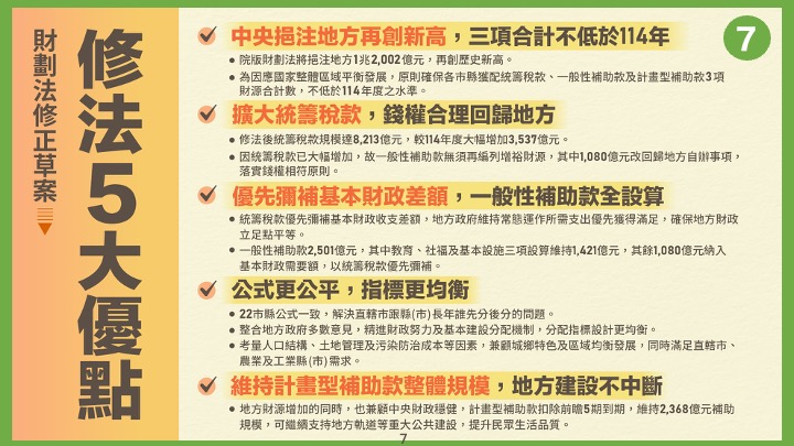 卓揆說明院版「財劃法」修正草案有三大原則,包括追求國家均衡發展、中央財政穩健、垂直分配調整合理;草案的五大目標,包括兼顧基本財政需要額、中央地方錢權分配更合理、提升中央地方夥伴關係、城鄉分配更公平、地方自治更強化。