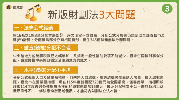 卓揆說,第二個結論,是各種分配不公平,會導致城鄉差距再擴大亦即「劫貧濟富」、讓強弱失衡;第三個結論,是維護程序正義,然明年度總預算仍在立法院審議程序,立法院竟匆忙通過「再修版」財劃法,要求行政院重編預算,違反中央與地方施政穩定性。