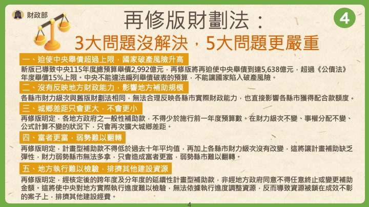卓揆表示,第四,「再修版」財劃法將中央財源大幅下放,計算方式對地方極不均等。他解釋,「再修版」要求將過去已完成的計畫型補助納入平均計算,使雙北等已有大型工程完成的城市,仍能獲高額回溯補助,反之,台南市、農業縣市與離島反而分配不足。