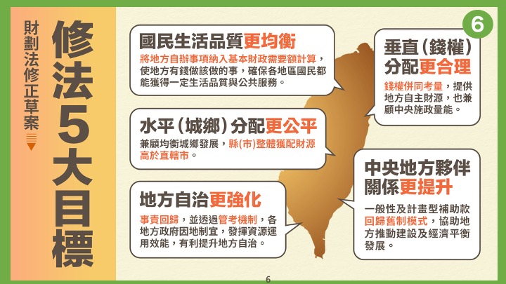 卓揆說明院版「財劃法」修正草案有三大原則,包括追求國家均衡發展、中央財政穩健、垂直分配調整合理;草案的五大目標,包括兼顧基本財政需要額、中央地方錢權分配更合理、提升中央地方夥伴關係、城鄉分配更公平、地方自治更強化。