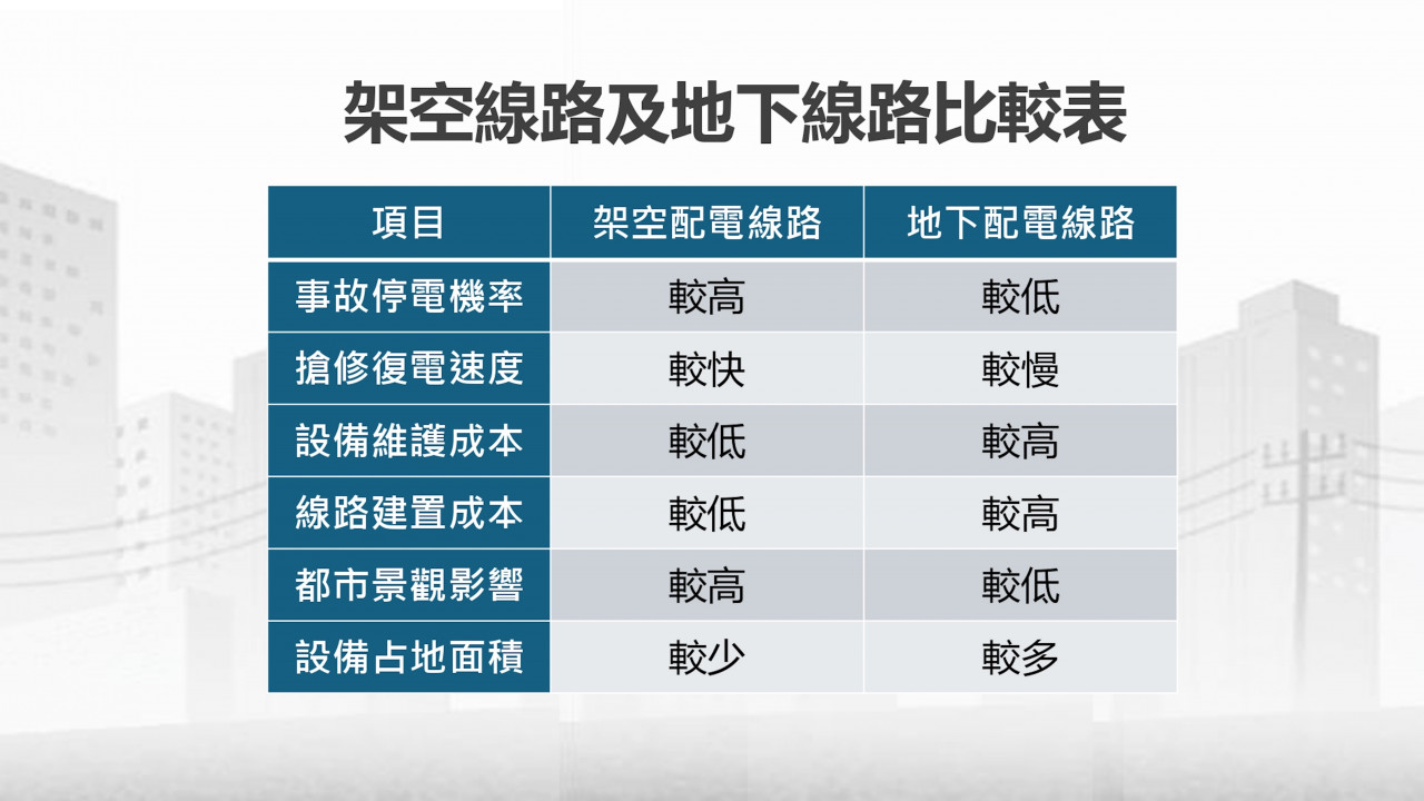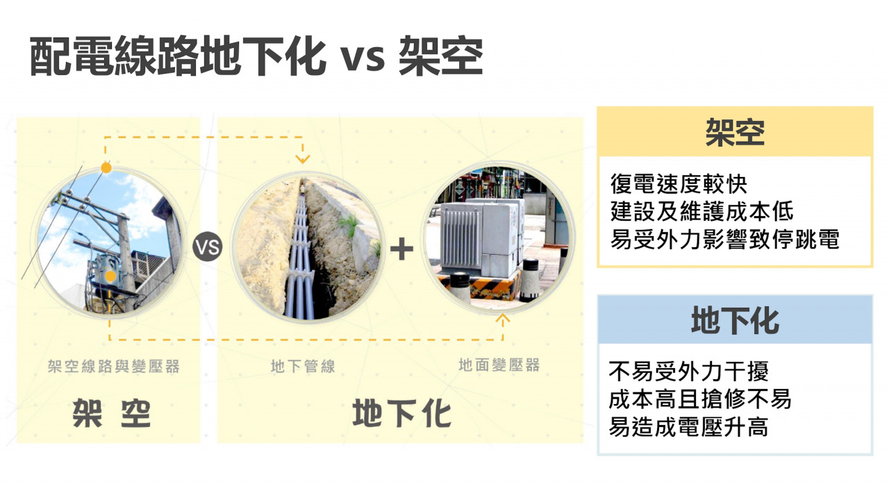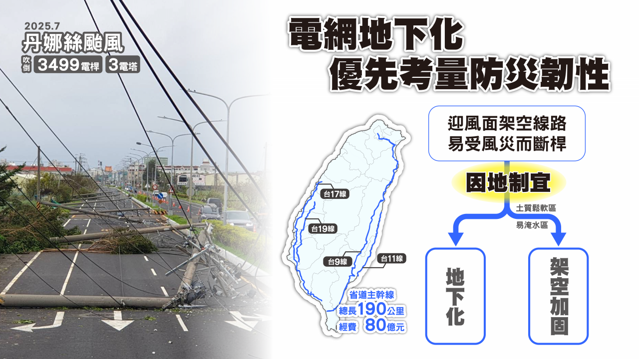 隨著地球暖化加劇,極端氣候帶來的考驗,乃至於每一次災害,都是對台灣公共建設的壓力測試。台電公司表示,架空線容易受外力影響,但維修迅速、成本低;地下化線路穩定、美觀,但遇淹水或禁挖政策時,搶修時間倍增,二種工法之間的利弊權衡,必須回歸到適地適性、因地制宜,方能打造最能承受災害的韌性電網與供電系統,讓停電不再成為颱風過後的集體焦慮。