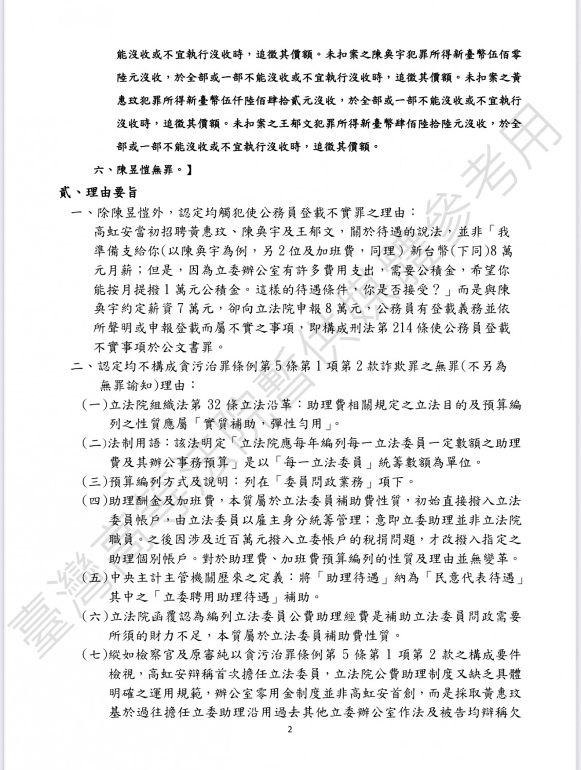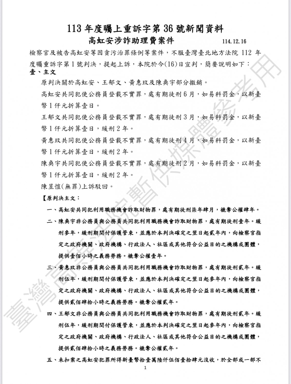 高虹安國會辦公室的4名助理,前行政主任「小兔」黃惠玟判4月;前公關主任「水母」王郁文判刑3月;前辦公室主任陳奐宇判刑2月,黃、王、陳3人皆得易科罰金,緩刑兩年。而前法務主任陳昱愷仍無罪。