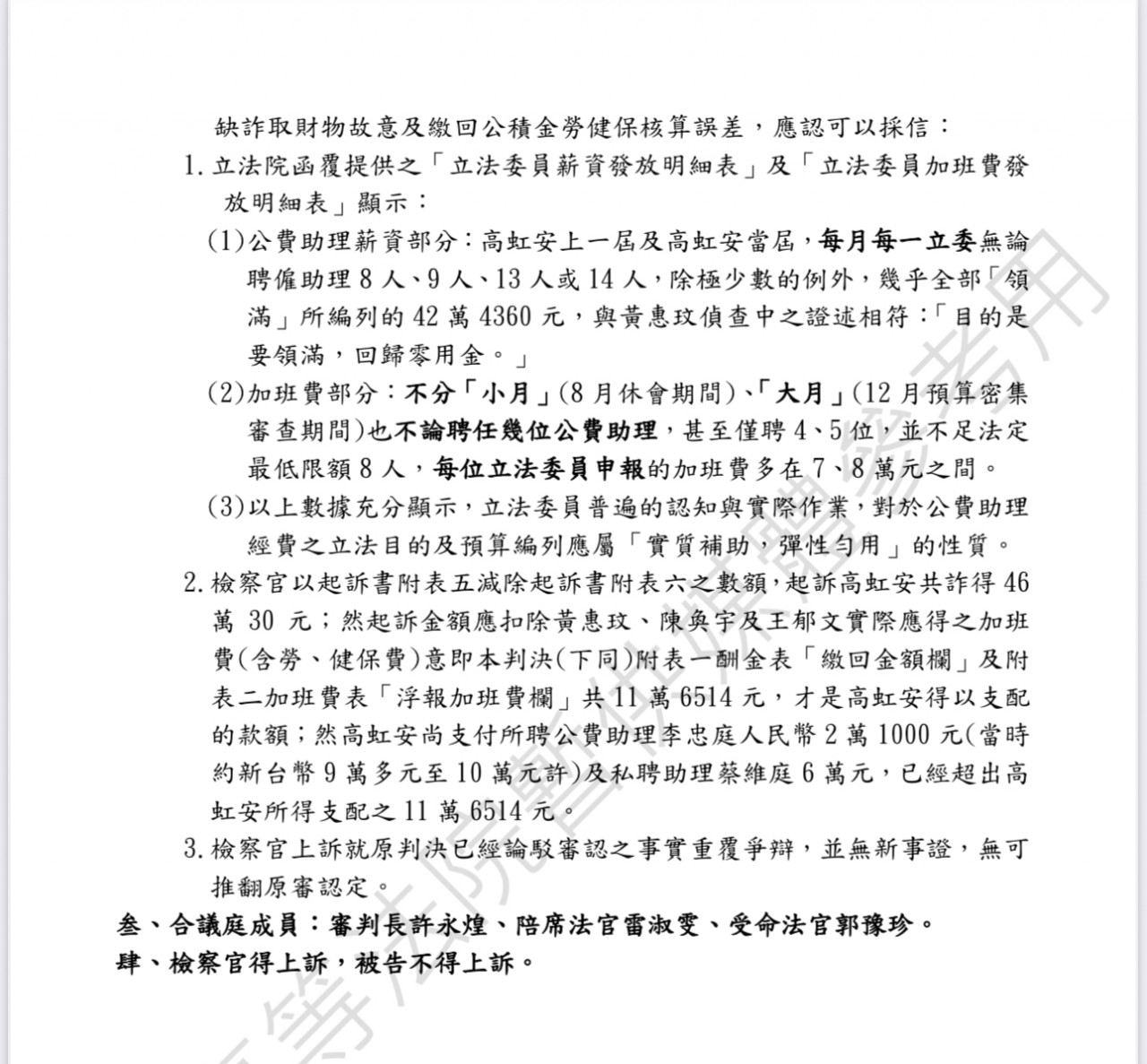 本案自偵辦以來,外界高度關注的爭點,始終在於「是否有人頭詐領」、「是否有中飽私囊」。但事實已一再證明,高虹安在立委任內,助理確有實際加班、實際投入公務服務,相關支出亦多用於公務用途,並無任何款項流入個人口袋,更非以助理費作為私人不法所得。