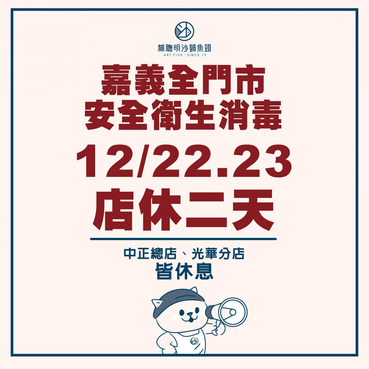 周一(12/22)林聰明沙鍋魚頭再於臉書發文表示為審慎確保用餐環境與餐點品質,嘉義中正總店與光華分店自即日起啟動自主消毒與衛生管理作業,並將於 12/22–12/23 暫停營業兩日。另針對其他已消費的顧客,設立專責窗口,啟動退款處理機制,將依公司作業流程協助辦理相關事宜。