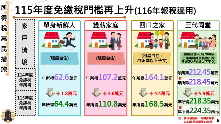 行政院長卓榮泰11/27於院會拍板多項減稅措施包含調高(115年)2026年度免(扣)額及稅率級距,減輕民眾負擔。據估算,115年報稅時,在基本生活費部分,將從21萬元調高至21.3萬元,估惠及202萬戶、減稅利益達12億元。
