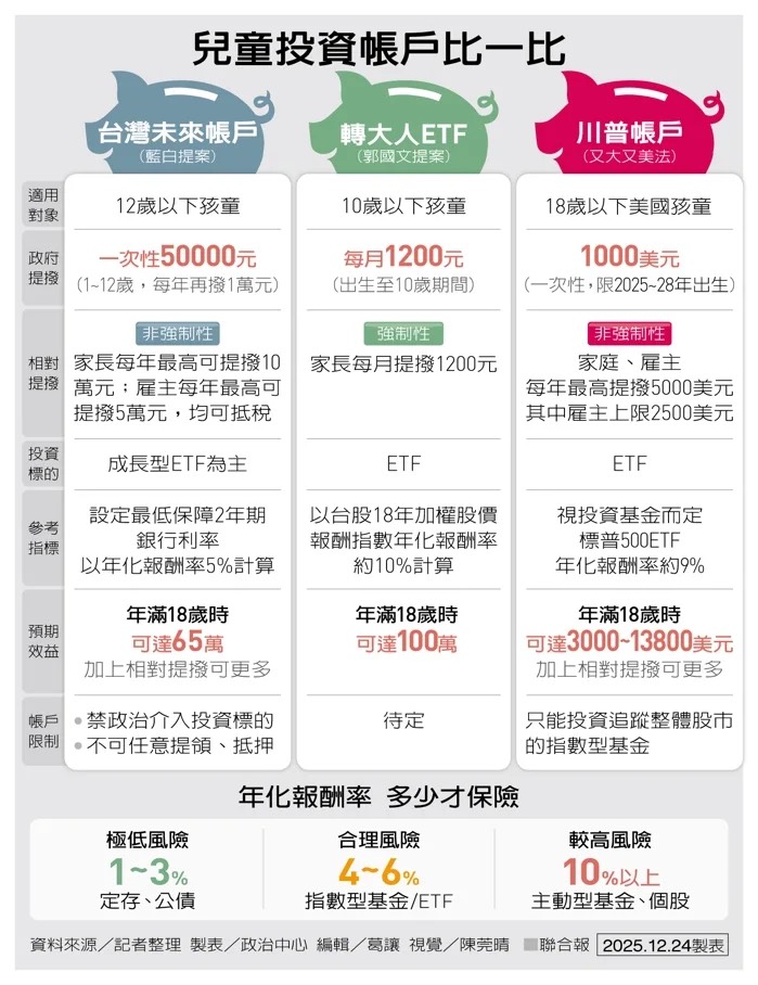 國民黨立委林倩綺指出,美國政府近期宣布兒童儲蓄計畫「川普帳戶」,投資18歲以下孩子長期儲蓄投資制度,跳脫育兒補助框架;國民黨智庫以此為架構,由政府提供種子基金,結合雇主與社會力量提撥,只允許投資大盤指數基金,避免高風險投機資金,強調長期持有的複利成長,原則上在成年前不得動用。