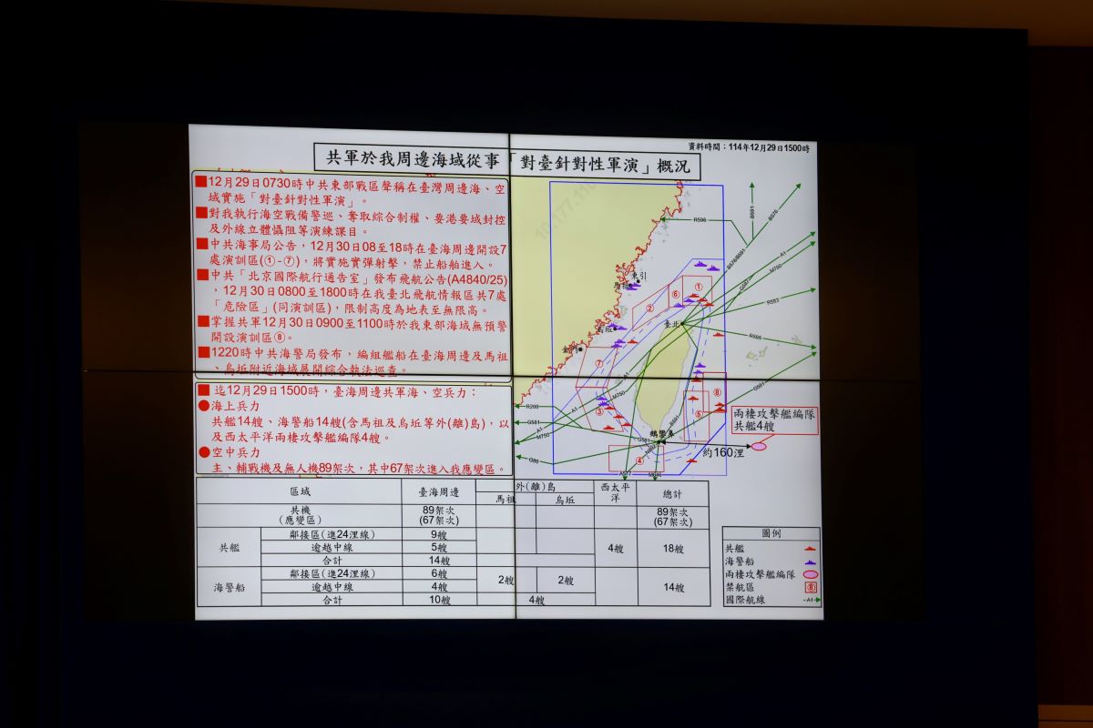 據國防部掌握,截至周一下午3時,台灣周邊共軍海空軍兵力掌握共軍海軍艦船共14艘、海警艦船共14艘、空中兵力則有主輔戰機、無人機共89架次,其中67架次進入我方應變區。