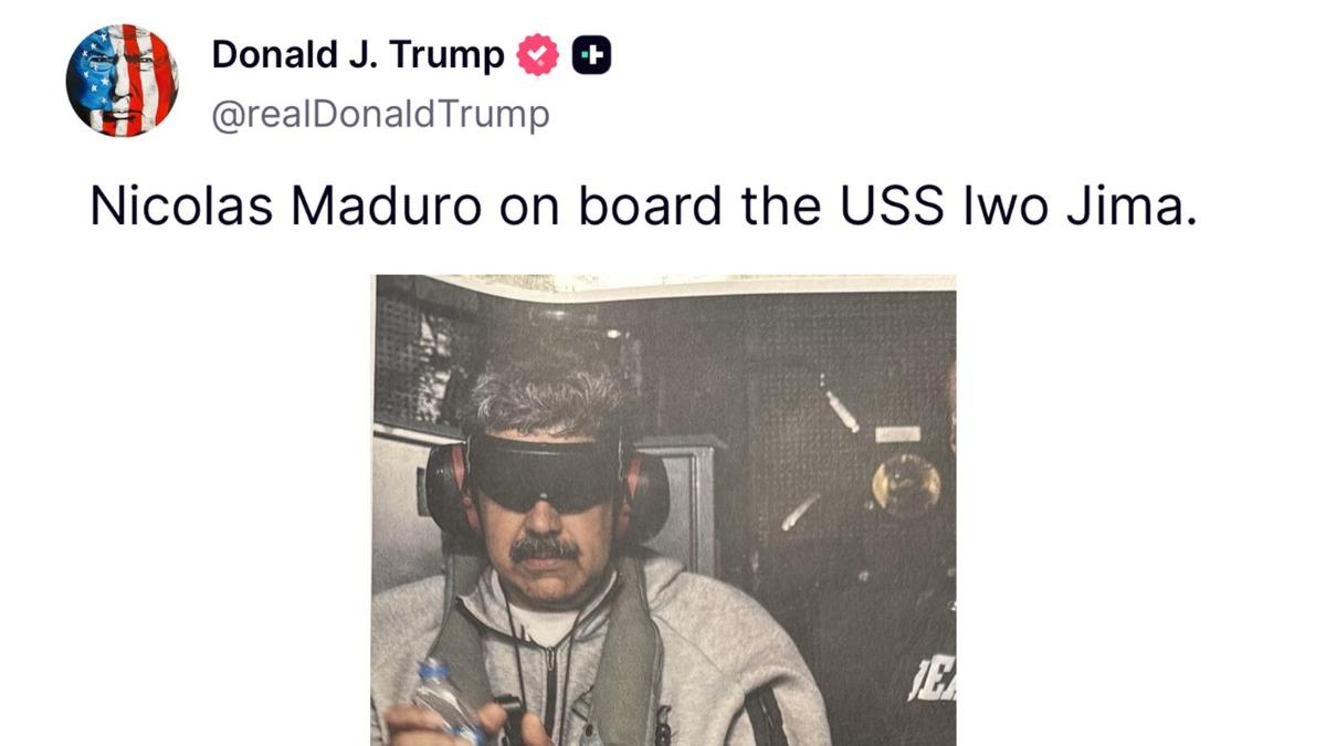美國白宮稍早在社群平台X上發布最新影片,影片中馬杜洛被相關人員戴上手銬,緩慢步行的畫面被白宮稱為「犯人遊街」(Perp walk)。昔日的總統威嚴已不見蹤影,不過面對鏡頭,馬杜洛仍相當鎮定,以英語說:「晚安!新年快樂!」