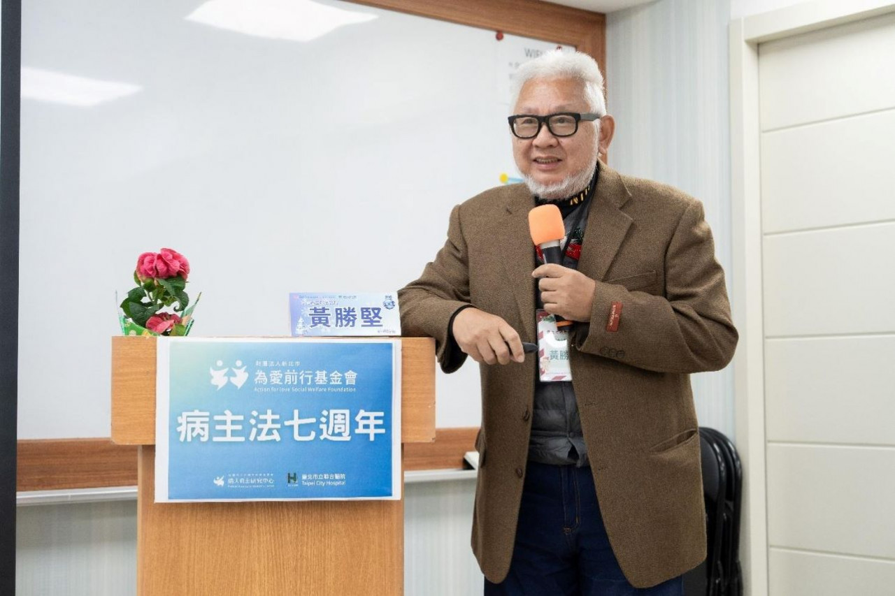 ▲臺北市立聯合醫院黃勝堅前總院長分析病主法面臨的「不知道、找不到、等不到」三大困境,並呼籲提升民眾生命識能與人本照護。