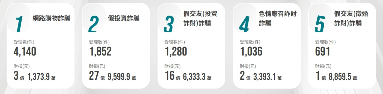 假投資詐騙的財損數、受理數雖然大幅降低,但詐騙集團馬上將觸角延伸至「網路購物詐騙」,即便單筆財損金額不高,但受理件數相當驚人。