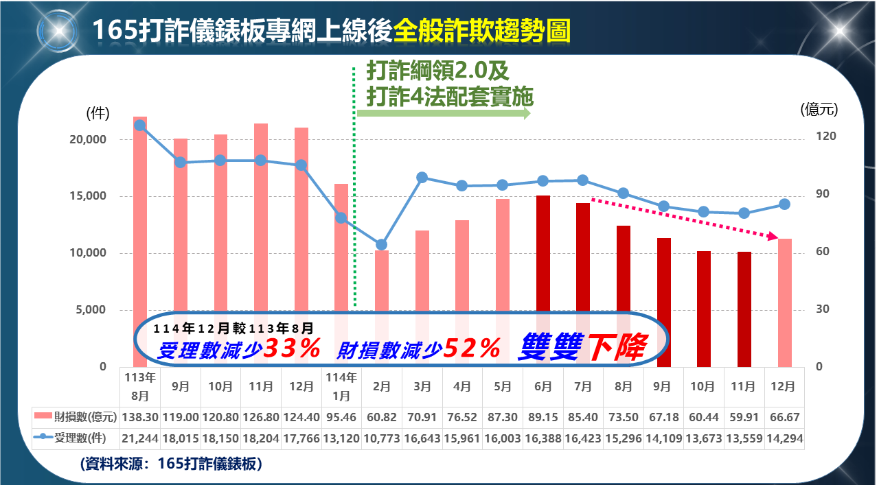 關鍵是過往財損金額最大、屢屢釀成社會憾事的「假投資詐騙案」,在檢警不遺餘力的偵辦、宣導預防下,單月財損金額更是從2024年8月的89億元,大幅下降至2025年12月的27.96億元。