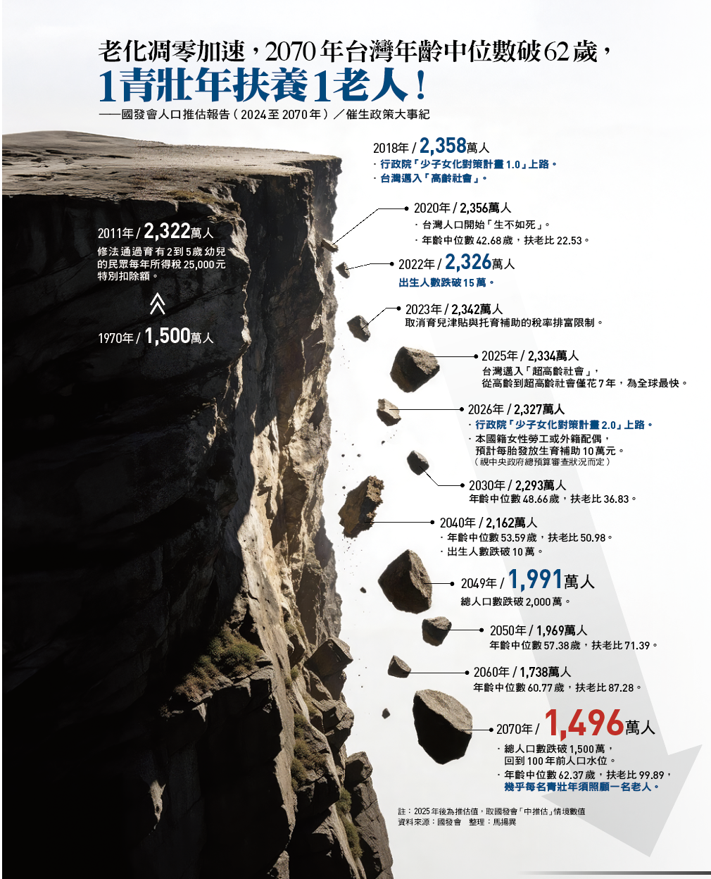 從二○二○年開始,台灣的人口結構將連續六年呈現出生人口低於死亡人口的「生不如死」趨勢。由於出生率極低,台灣僅花七年,老年人口比率就從十四%成長至二○%,在二五年正式由高齡社會邁入「超高齡社會」,全球沒有任何一個國家,突破超高齡社會門檻的速度比台灣更快。