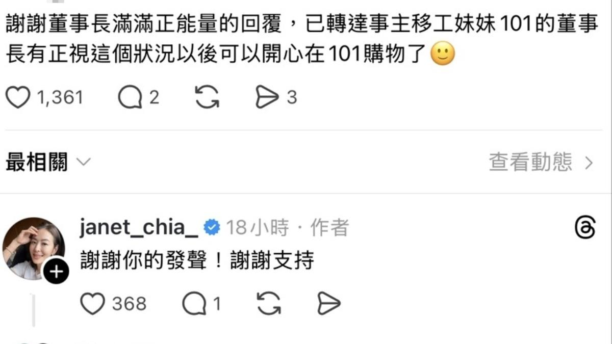 而當事移工得知此事被重視後,也透過友人發聲:「謝謝101董事長正視這個狀況,以後能開心在101購物了」。賈永婕也回應,「謝謝你的發聲,謝謝支持」。
