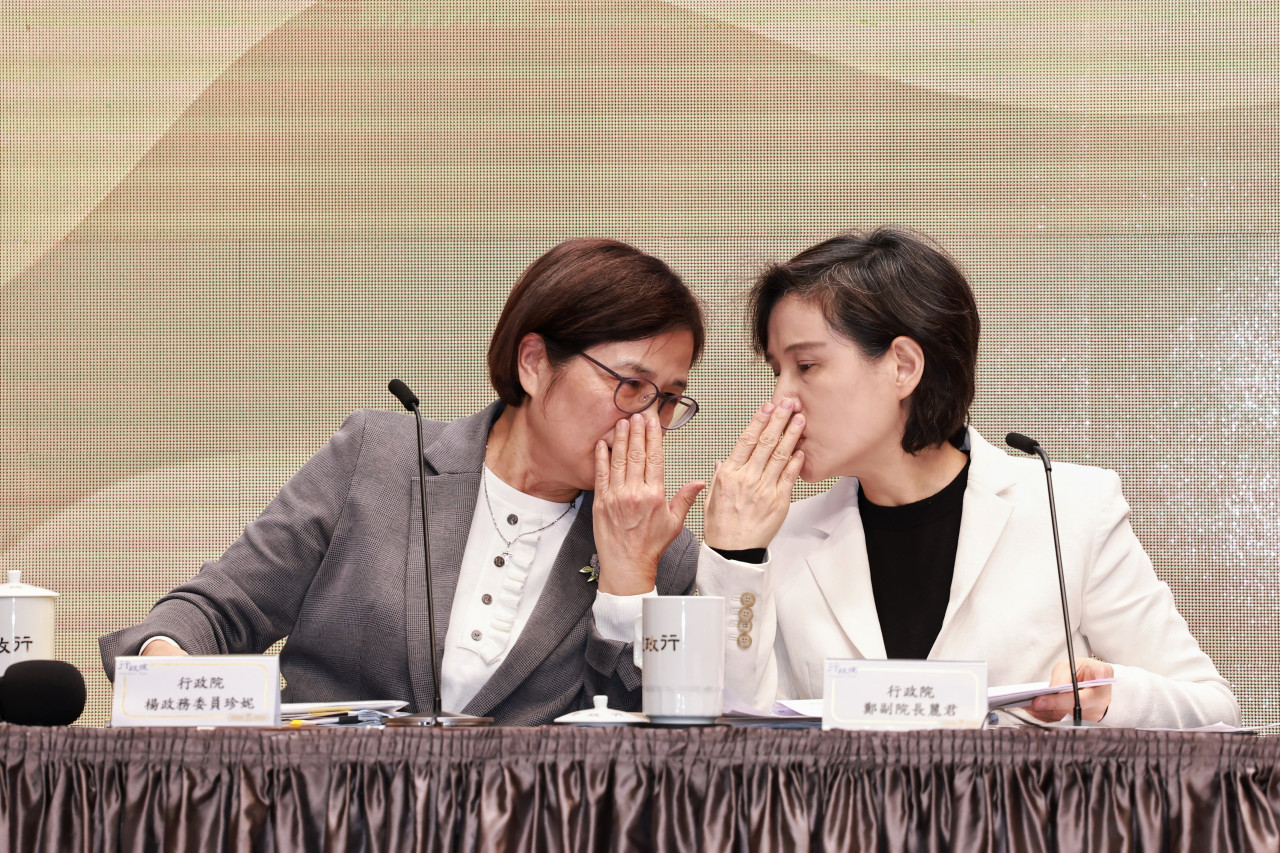 ▲行政院副院長鄭麗君(右)與經貿談判辦公室總談判代表楊珍妮(左)在行政院記者會上交換意見。記者劉咸昌攝影