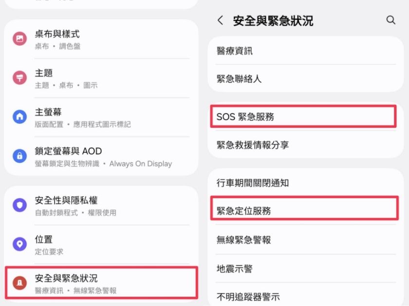 ▲三星手機能夠設置「SOS緊急服務」、「緊急定位服務」設定。(圖/擷取自 三星手機)