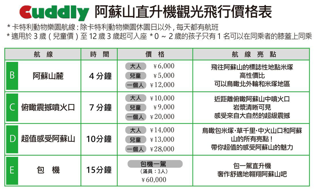 ▲阿蘇山直升機遊覽價目表。(圖/擷取自 阿蘇卡德利動物樂園官網)