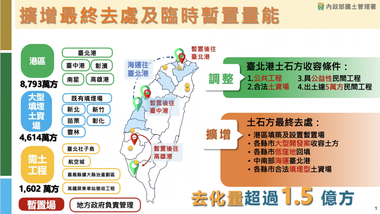 劉世芳說明,行政院已協調台北港14公頃、台中港5公頃、桃園科技園區6.7公頃、彰濱工業區82公頃及台南大學七股校區27公頃等處,積極提供土石方暫置土地,另民間所提建築基地或異地暫置部分,可依都市計畫及非都土地分區或用地,結合餘土計畫及建管程序來臨時暫置。