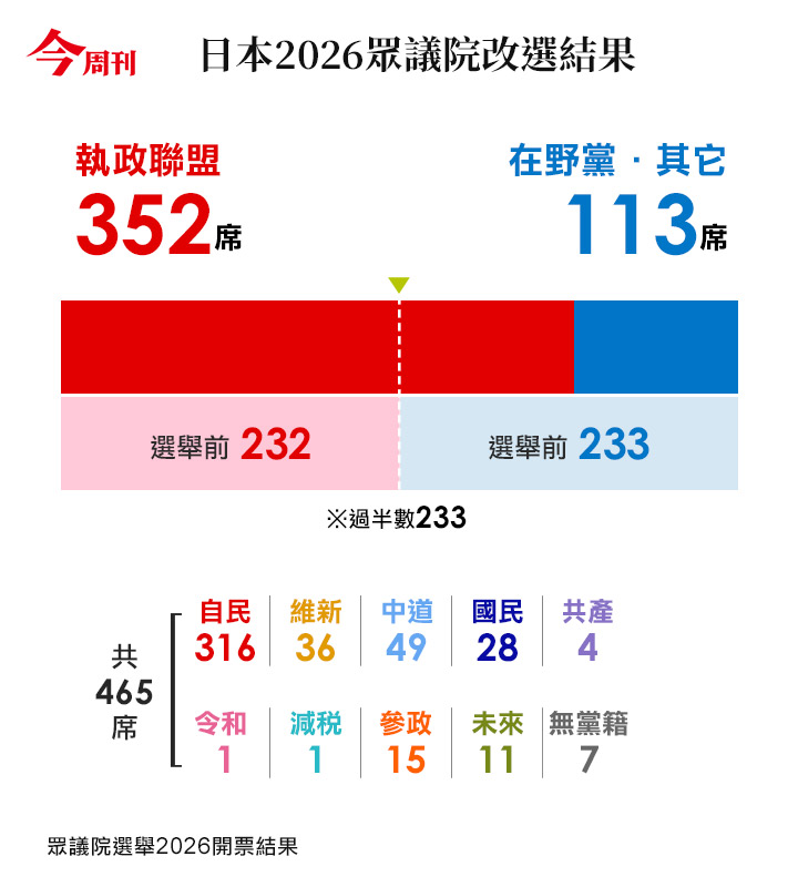 日本眾議院總席次465席,自民黨單獨就獲得316席,比原本198席大幅進步,直接闖過3/2的修憲門檻,與自民黨組成執政聯盟的日本維新會,同樣取得36席的佳績。