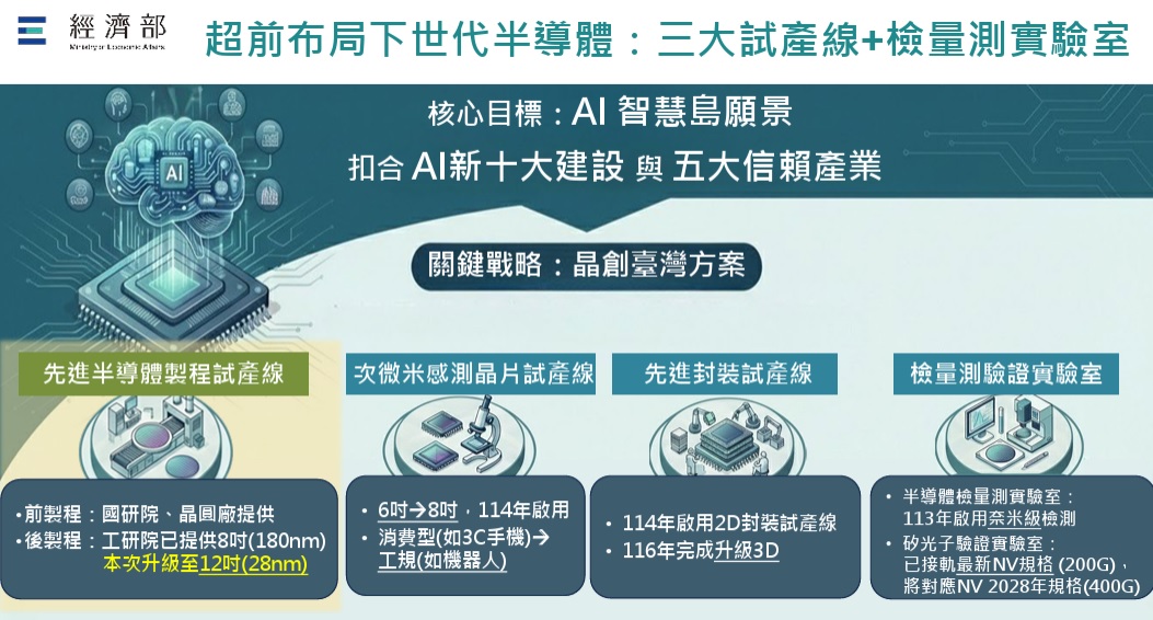 「很多的中小型IC設計業者,他們有特殊的少量多樣的功能晶片,需要有投片的機會。(工研院)半導體8吋廠已經舊了,我們應該要有一個新的12吋廠,才能達到這樣的功能。」