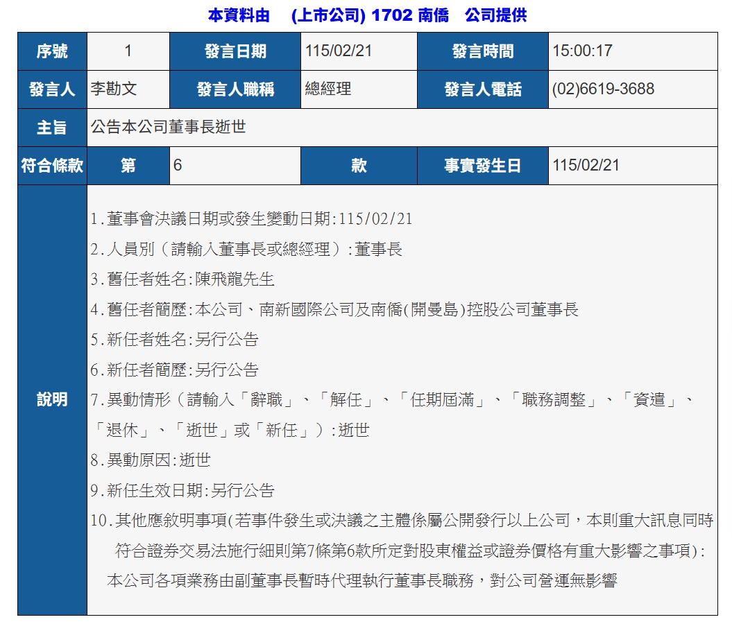 南僑(1702)發布重訊公告,南僑集團(1702)會長、董事長陳飛龍辭世,享耆壽90歲,日後將另行公告繼任接班人選。南僑亦發布聲明表示,陳飛龍於2月12日在神的引領下、在家人的陪伴下安詳辭世,追思會所成立於2月24日供各界弔唁。