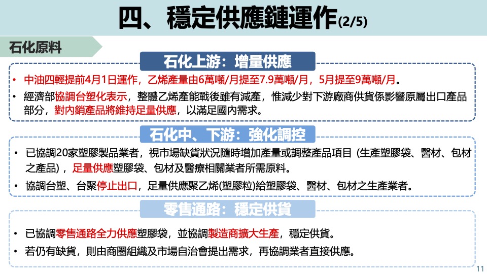 此外,根據鄭麗君使用的簡報指出,行政院已協調20家塑膠製品業者,視市場缺貨狀況隨時增加產量或調整產品項目 (生產塑膠袋、醫材、包材之產品),足量供應塑膠袋、包材及醫療相關業者所需原料,同時協調台塑、台聚停止出口,足量供應聚乙烯(塑膠粒)給塑膠袋、醫材、包材之生產業者。