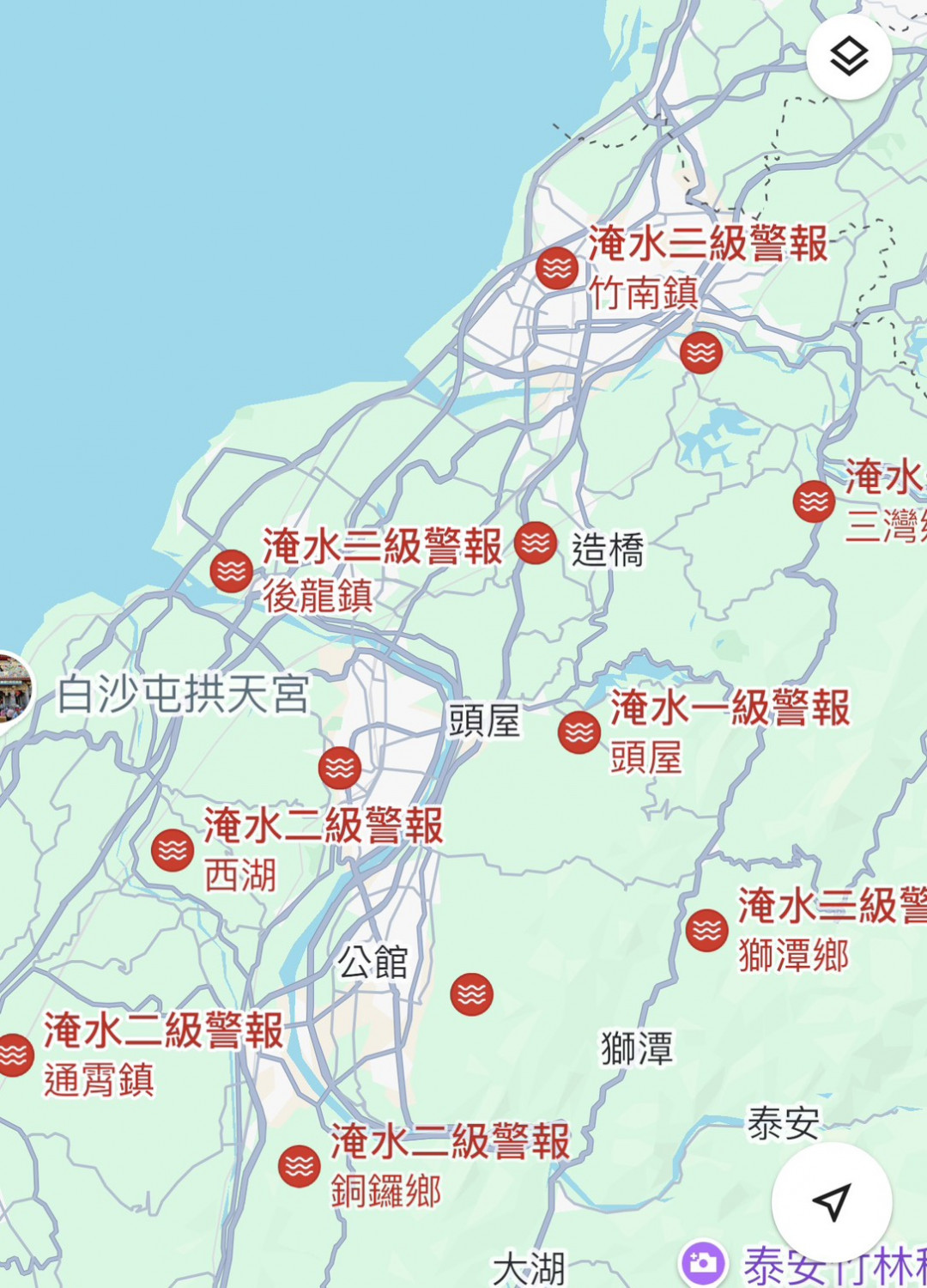 受大豪雨影響,經濟部水利署在中午12點針對苗栗縣公館鄉、雲林縣莿桐鄉發布二級警戒。