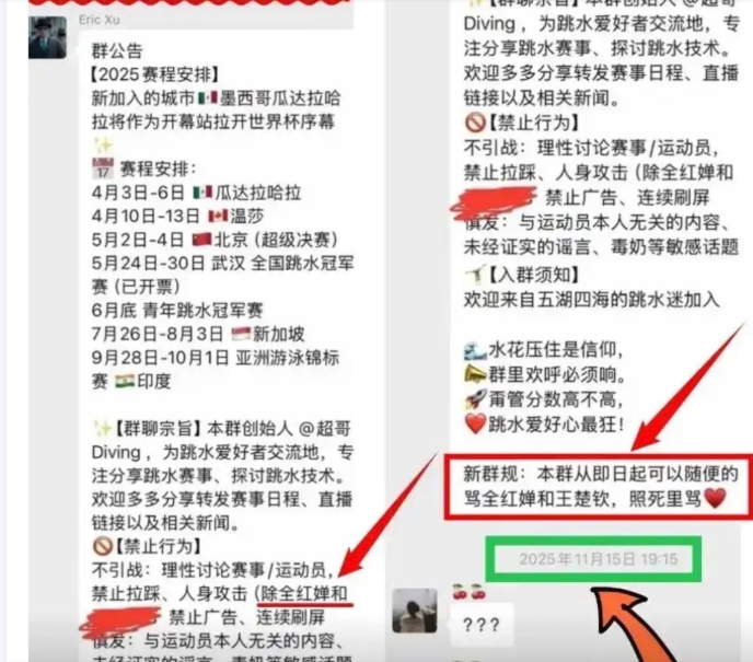 綜合中國媒體報導,根據網路截圖爆料指出,擁有282人的微信群組「水花征服者聯盟」,群組公告竟寫道「禁止攻擊其他運動員(全紅嬋除外)」,還針對全紅禪使用大量侮辱性綽號,甚至早在2025年11月15日,該群組設立新規定,明確指出「本群即日起可以隨意的罵全紅嬋和王楚欽,照死裡罵」。