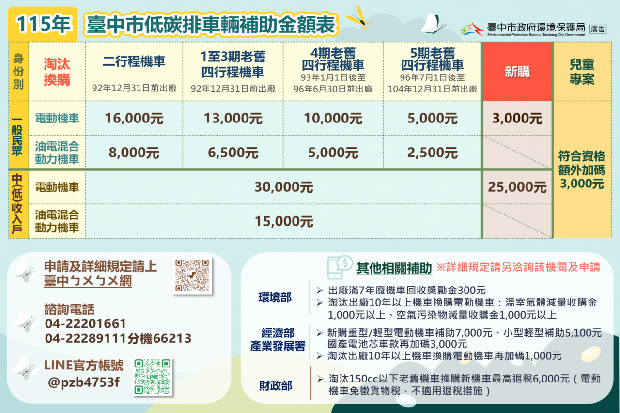 臺中市近年除積極導入綠能公車外,同時鼓勵市民使用大眾運輸,減少移動污染源排放。為進一步提升臺中市低碳排車輛占比,並持續淘汰轄內老舊機車,市府於115年度提供老舊機車淘汰換購電動機車、換購油電混合動力機車及新購電動機車三大類補助方案,申請名額無上限,使符合資格民眾皆能獲得購車補助。一般民眾依據淘汰之老舊機車行程別與期別,可申請不同補助金額,換購電動機車補助新臺幣5,000元至1萬6,000元;換購油電混合動力機車則補助新臺幣2,500元至8,000元。中、低收入戶不分淘汰車輛,換購電動機車一律補助新臺幣3萬元;換購油電混合動力機車則補助新臺幣1萬5,000元。針對單純新購電動機車的市民,一般民眾補助新臺幣3,000元,中、低收入戶補助新臺幣2萬5,000元,歡迎符合補助資格的市民踴躍申請。考量到電動運具使用年限,市府於115年度開放105年1月1日前曾申請購車補助民眾再次申請,擴大市民受益機會,加速低碳運具轉型進度。另編列經費提供兒童專案,除原有補助金額可再加碼新臺幣3,000元,暖心照顧育兒家庭於響應低碳運輸之餘,亦可減輕購車負擔。