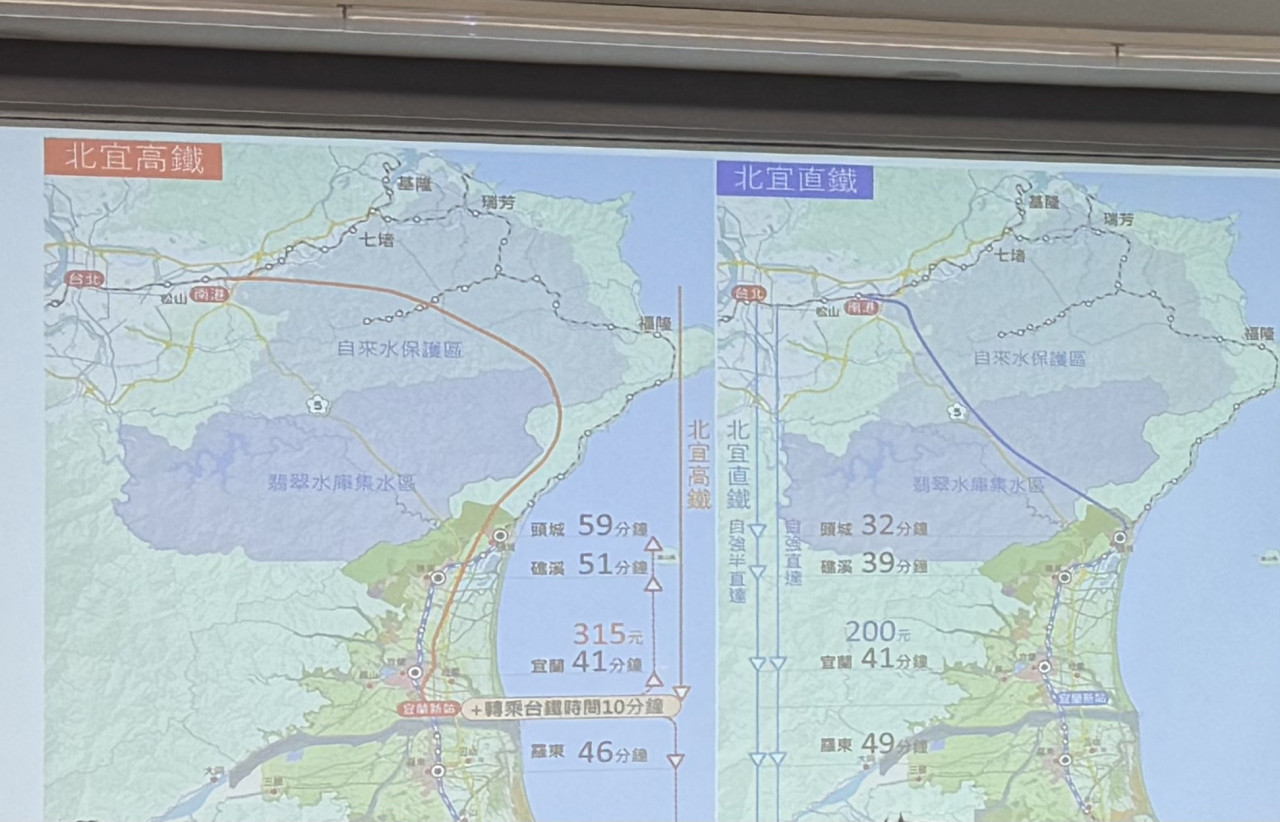 高鐵延伸宜蘭方案、北宜直鐵路線圖。圖片來源:翻攝賀陳旦演講簡報