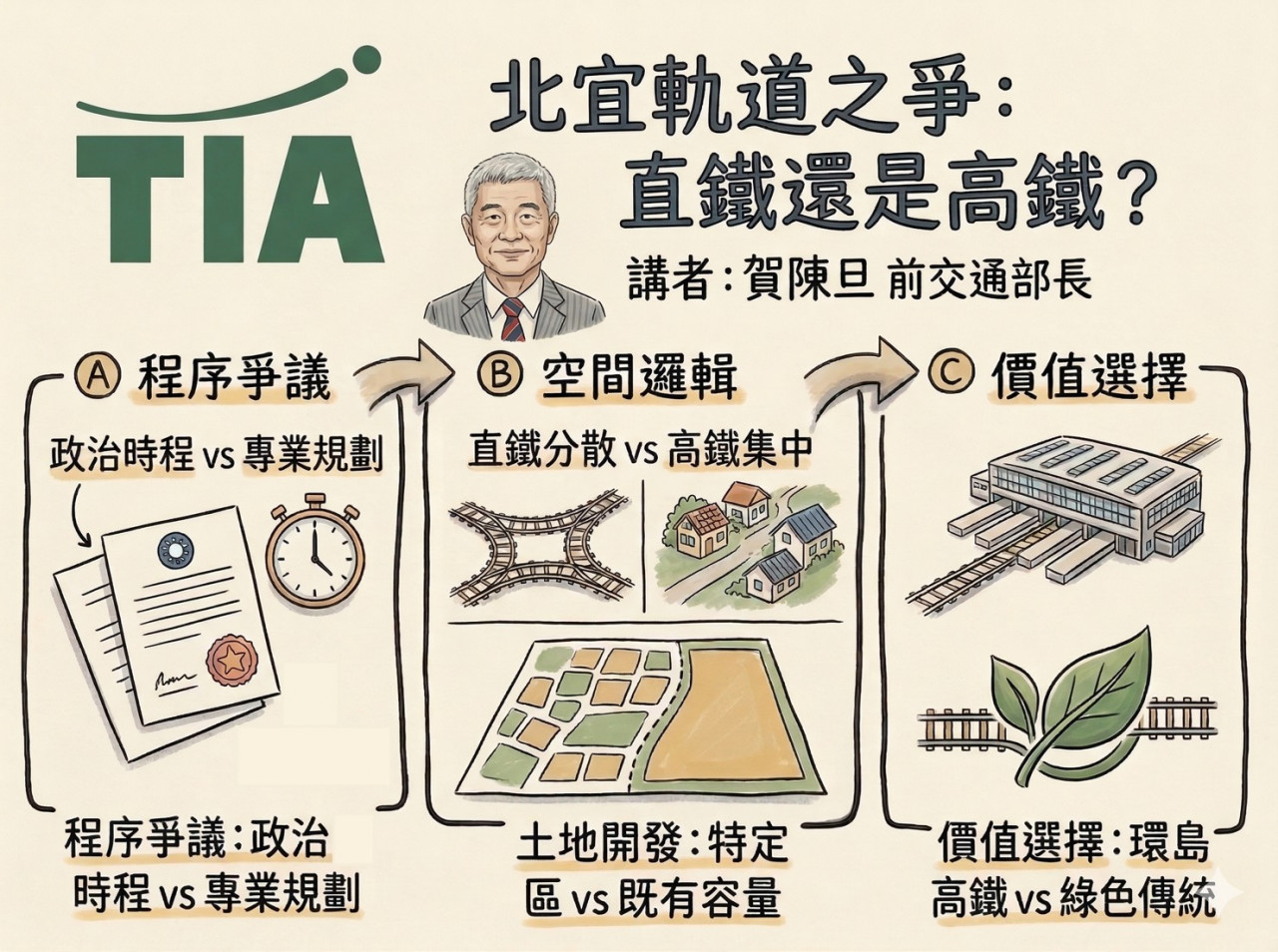 高鐵延伸宜蘭案2025年通過環評,且全案已送進行政院審議,但包括交通部前部長賀陳旦與不少民間團體力主喊卡,並質疑鐵道局過度美化高鐵數字。到底「直鐵還是高鐵?是鄉土還是選舉?」賀陳旦 11 日應TIA台灣勵志協會邀請,以此為題探討政策轉折與潛在爭議。