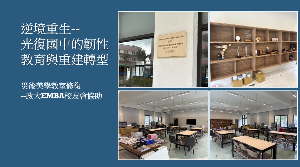 國立政治大學EMBA校友會本於「人飢己飢、人溺己溺」精神,在花蓮縣立光復國中於114年9月23日遭逢洪災重創後,主動發起關懷與募款行動,協助校園災後復原與重建,協力守護偏鄉學子受教權。
