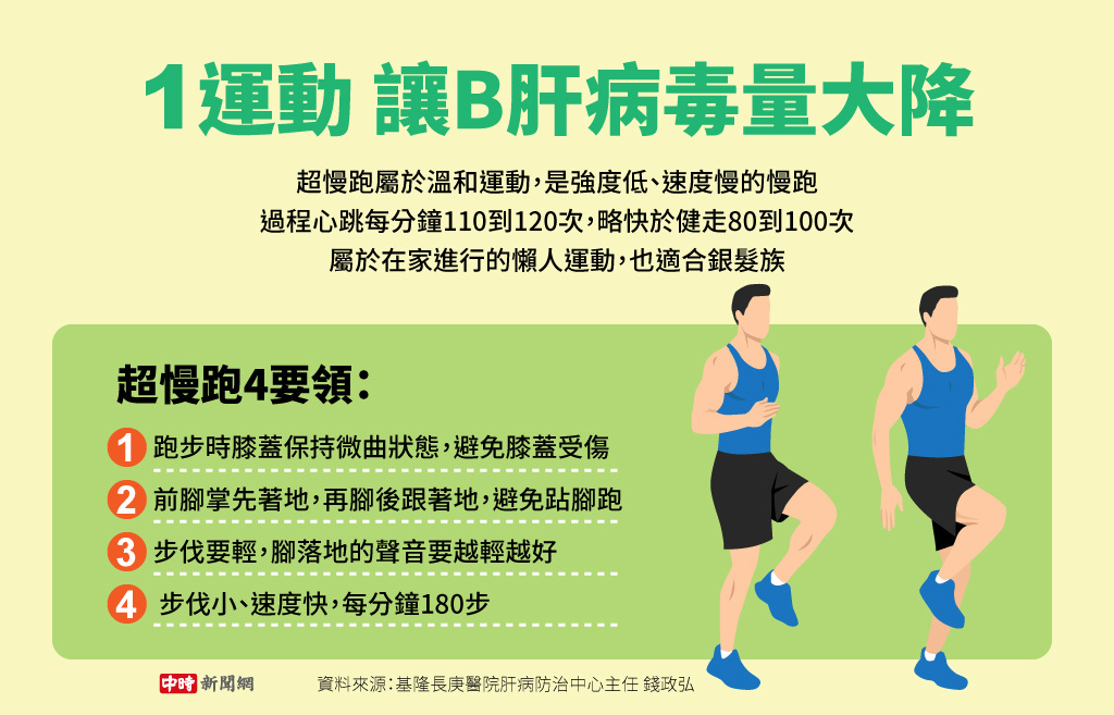 一名B肝帶原者平常飲食、作息正常,過去7年病毒持續下降,但半年前病毒量反常上升,為防急性肝炎發生,她開始每天在家「超慢跑」半小時,結果病毒量大降,還低於過去幾年控制的病毒量。醫師表示,超慢跑是一種強度低、速度慢的慢跑,心跳約每分鐘110~120次,非常適合懶人運動,因可改善肝臟血液循環,進而改善肝功能。