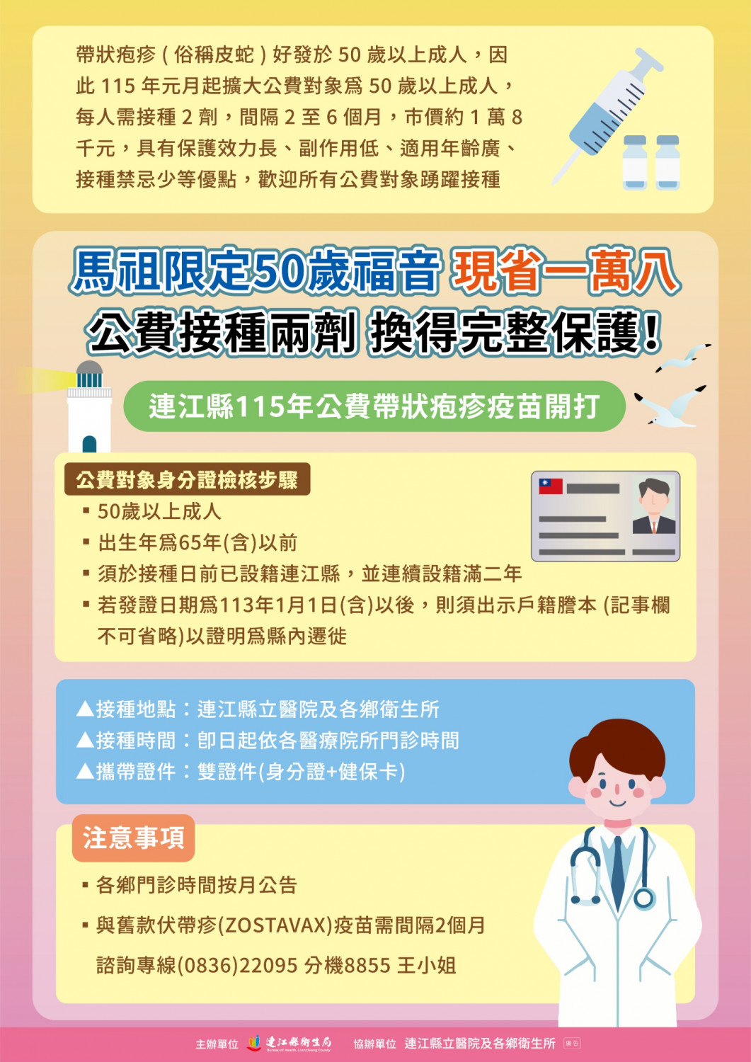 不過,好消息來了,包括台北市、新北市、新竹市、嘉義縣、嘉義市、台南市在內,全台有13個縣市開始補助帶狀皰疹疫苗,有些縣市「直接免費」。最新消息是彰化縣日前宣布,提供1萬名縣籍65歲以上長者完成兩劑接種;而連江縣則自2026年1月1日起,公費帶狀疱疹疫苗接種對象擴大至50歲以上縣民。