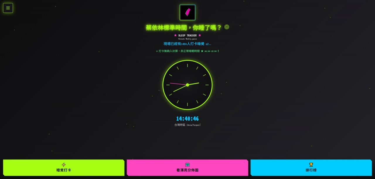 想不到最近又有神展開!一名網友幽默表示與朋友相約,結果對方回覆「大概約蔡依林睡一個小時碰面」,在社群上掀起「蔡依林時間」風潮。成為另類焦點;更有神人製作「蔡依林標準時間,你睡了嗎?」網站,不僅放上中原標準時間,還可以依照自己的睡覺時間來打卡,更統計出哪個縣市的人較早睡、大部分的人幾點睡覺...再次掀起一波睡覺風潮。