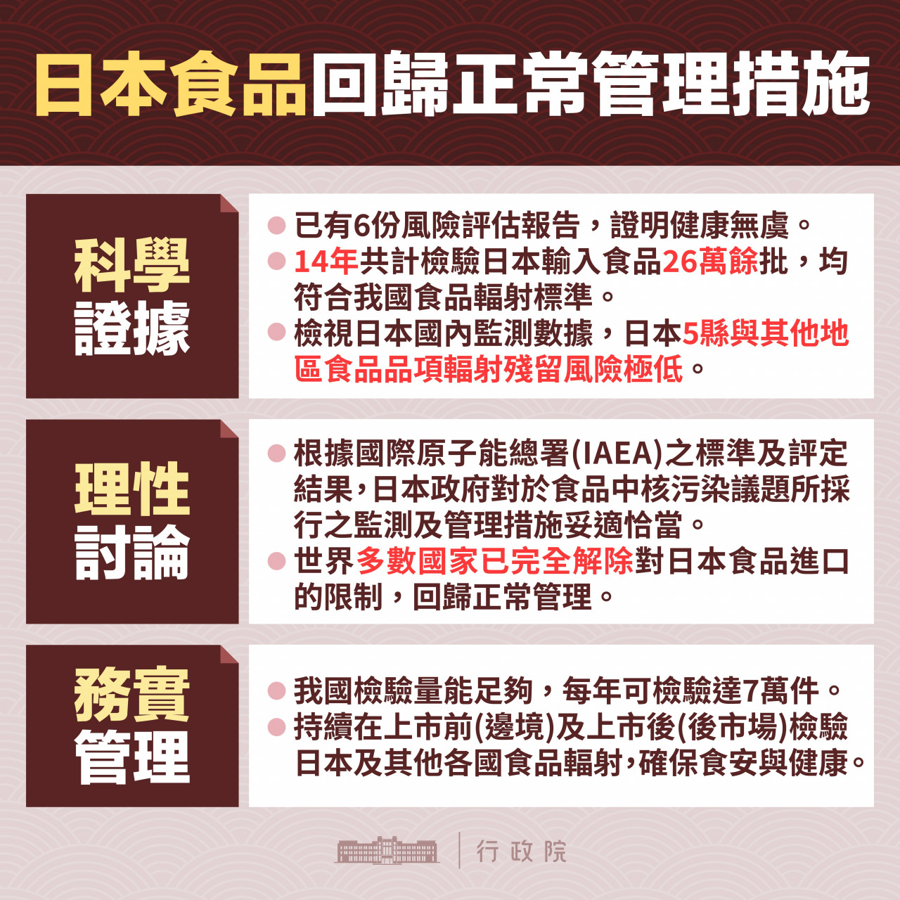 食藥署發布新聞稿指出,國際原子能總署(IAEA)資訊顯示,日本政府已採取妥適監測及因應措施,並依結果滾動更新食品管制,有效保障供應鏈安全。