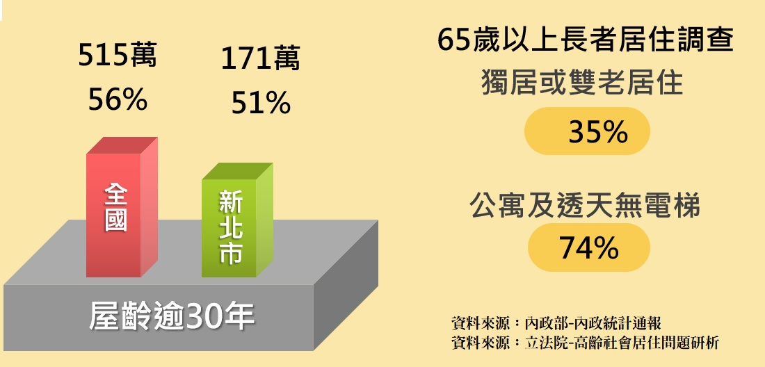 不僅如此,新北市還面臨「屋老」問題。全台30年以上老屋已占56%,新北市也高達51%;另據內政部統計,全台有35%長者獨居或與老伴雙老居住,而這群長者有74%是住在沒有電梯的公寓或透天厝。「身體衰弱的老人若住在4樓以上無電梯公寓,其實比住在偏鄉還沒有辦法出門!」