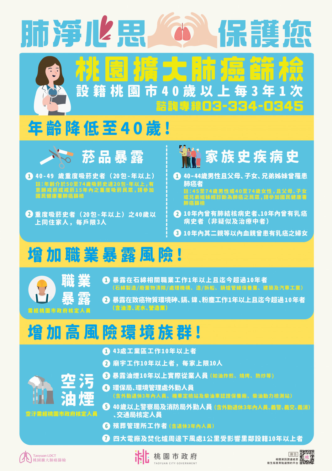 肺癌長年高居國人癌症死因之首,也是全球死亡率最高的癌症之一。為了守護桃園市民健康,在國健署的政策基礎上,桃園市率先將肺癌的篩檢條件放寬,讓更多潛藏高風險的市民得以納入篩檢計畫。