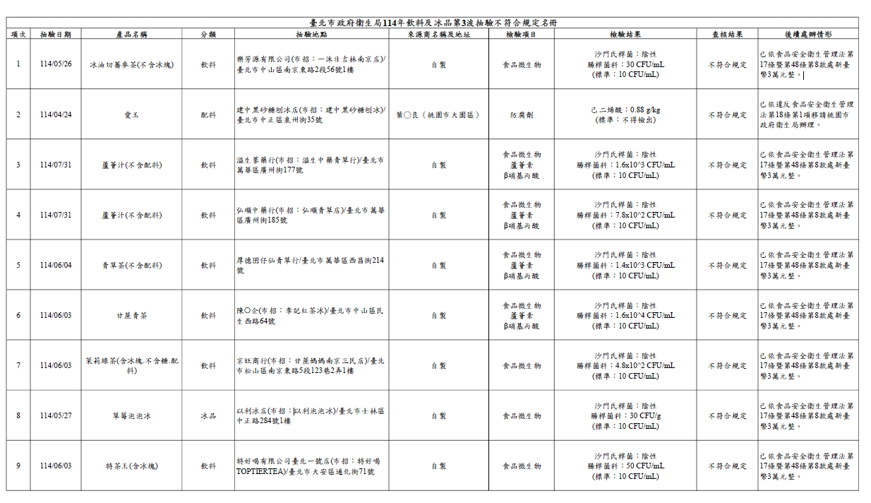 包括知名飲料品牌一沐日吉林南京店、甘蔗媽媽南京三民店、民生西路李記紅茶冰,以及建中旁有名冰店「建中黑砂糖刨冰店」、士林「以利泡泡冰」,抽驗到沙門氏菌或防腐劑己二烯酸。