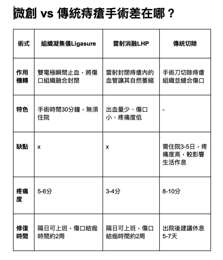 微創與傳統痔瘡手術比較,圖片由黃郁純醫師提供