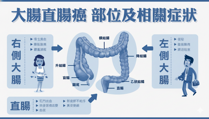 大腸直腸癌部位及相關症狀,圖片由黃郁純醫師提供