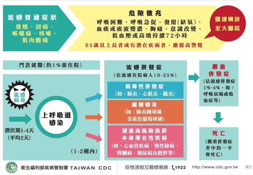 流感症狀包括發燒、頭痛、流鼻水、喉嚨痛、咳嗽、肌肉酸痛及疲倦等。高危險群的病患,可能引發嚴重併發症,甚至導致死亡;最常見併發症為肺炎,其他還可能併發中耳炎、鼻竇炎、腦炎、心肌炎、心包膜炎等。