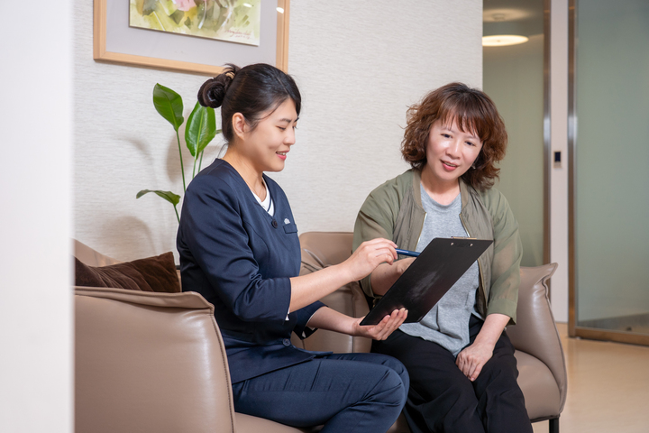 ▲健檢師(左)在健檢流程中不時向艾莉(右)溝通說明,讓她倍受呵護。