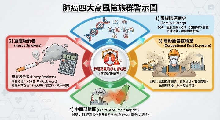 肺癌四大高風險族群警示圖(圖片來源:何建輝醫師)
