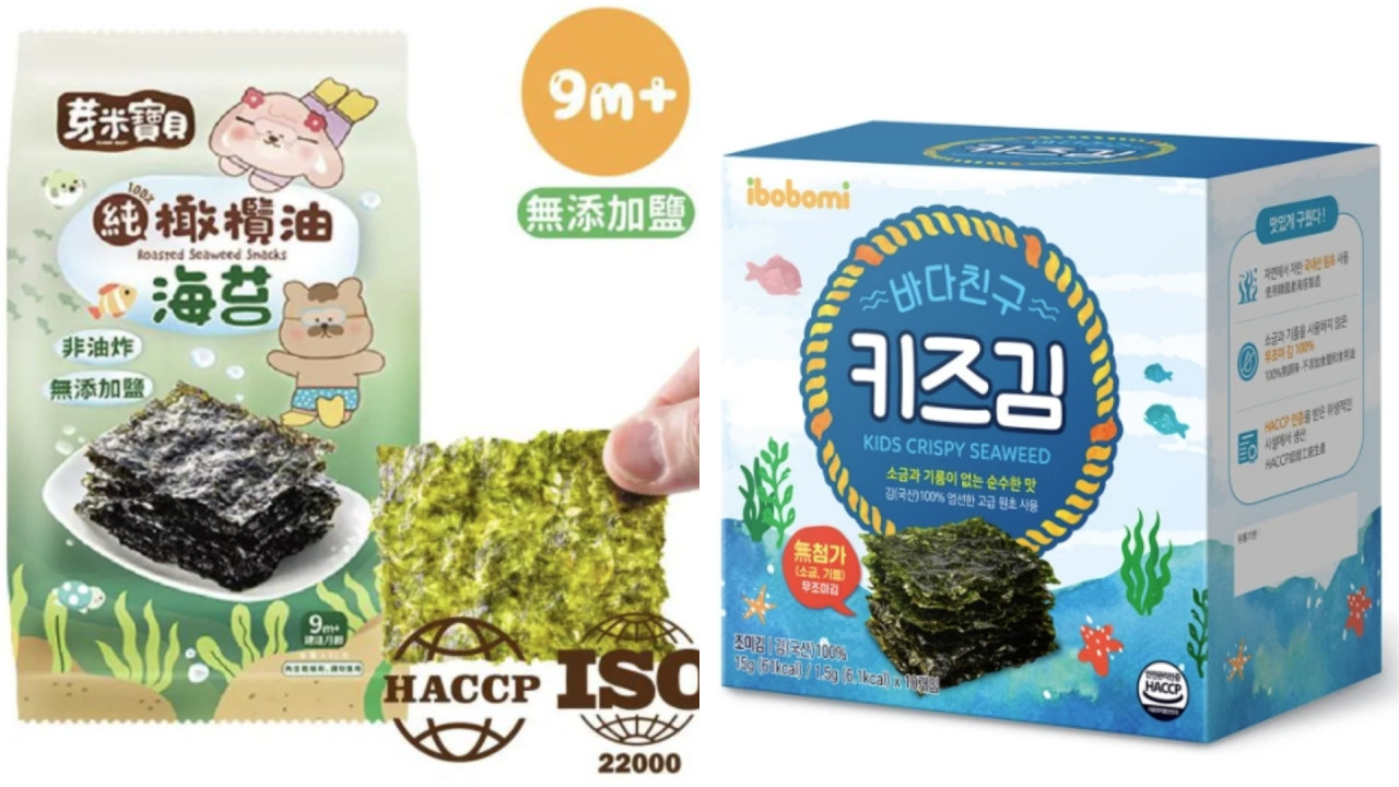 芽米寶貝100%純橄欖油海苔、ibobomi無調味海苔片。(圖/翻攝自蝦皮、momo官網)